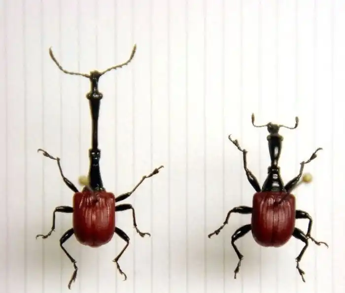 Что же у этих ребят с размножением? Тут всё стандартно. Парни устраивают гладиаторские бои, используя свои длинные шеи. Жучары всеми силами стараются отправить своего соперника в пешее эротическое путешествие, а если точнее, свалить с листочка, где проходит состязание. Самочка ставит борцухам оценку и выбирает, кого свайпнуть влево, а кого — вправо.