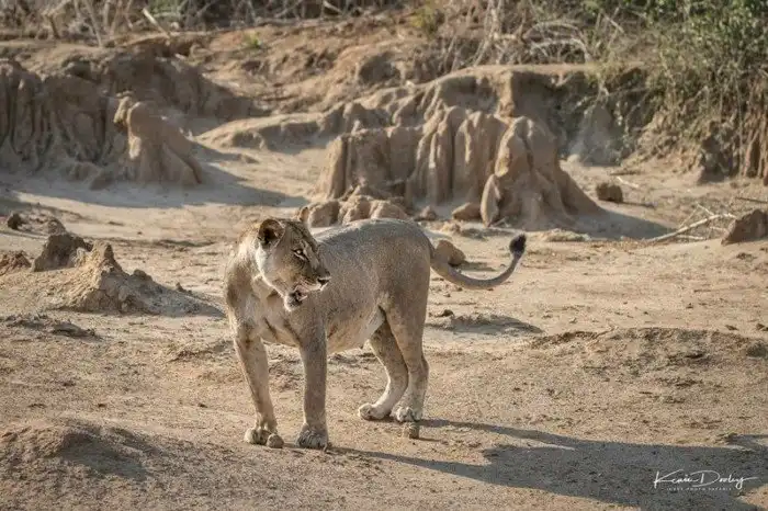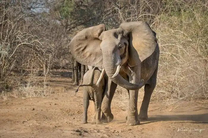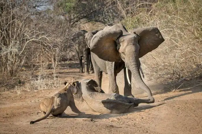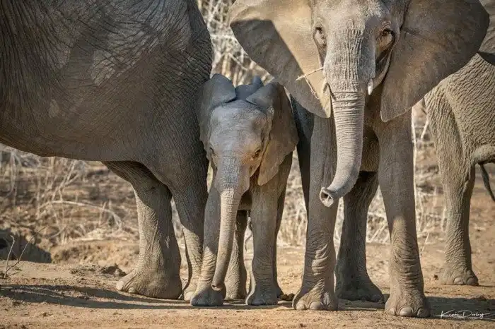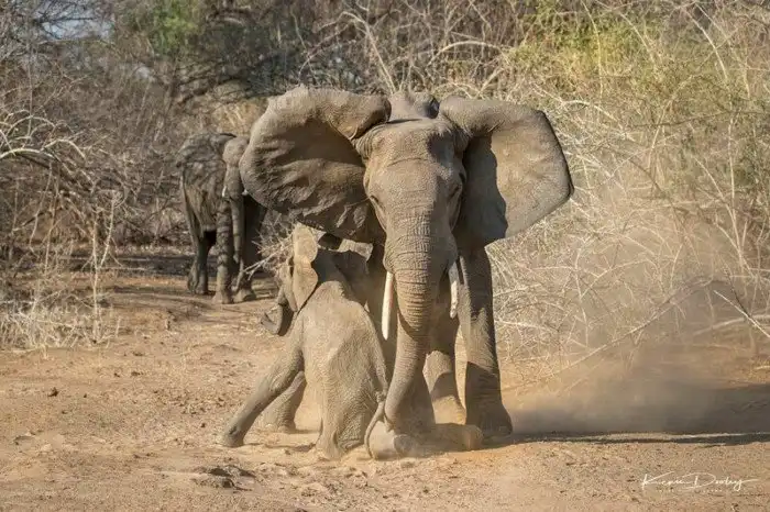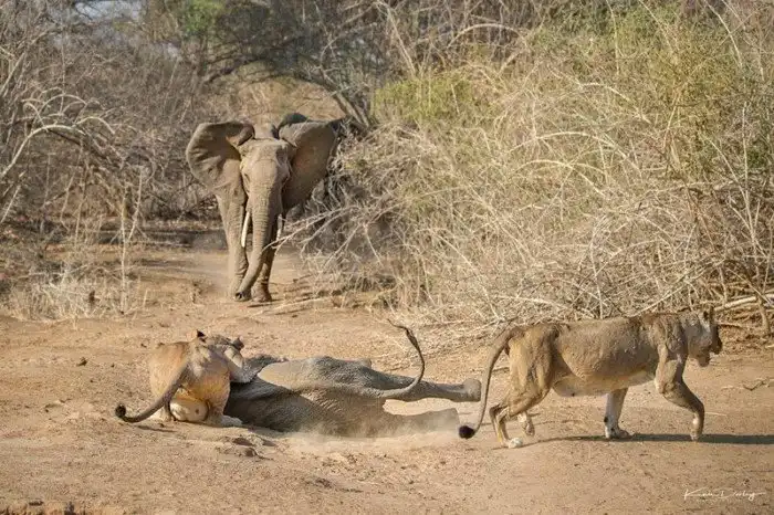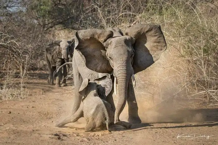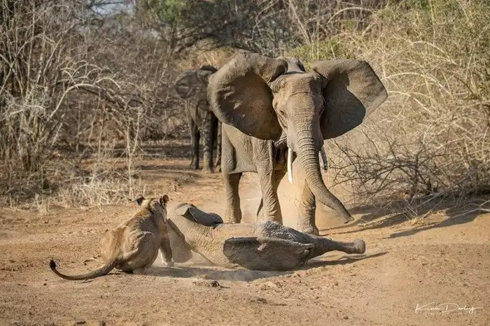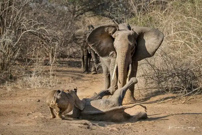 Со слов Кевина Дули, слониха, услышав зов своего детёныша, сразу же прибежала на помощь и отогнала от него голодных хищниц.