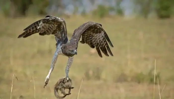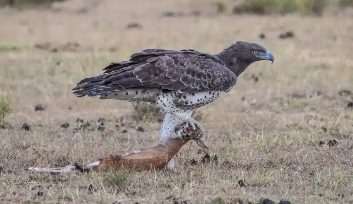 Помимо крупной дичи, боевой орёл также может перекусить мелкими млекопитающими, ящерицами и змеями.