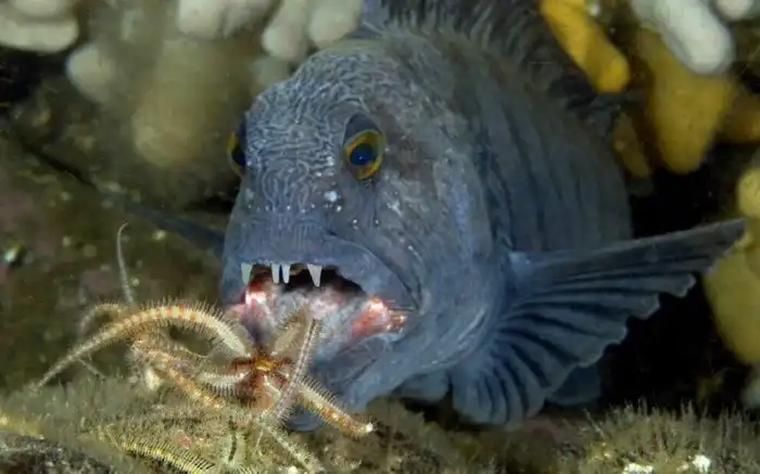 Морские волки крайне агрессивные создания. Выловленная рыба будет биться до последних сил. За их нрав рыбаки и обозвали животину волком.