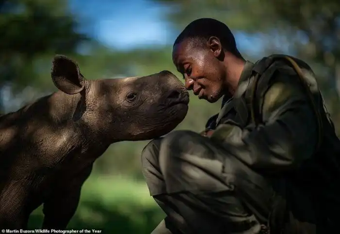 Герои снимка, сделанного в национальном парке Льюа на севере Кении, - рейнджер Элиас Мугамби, который ухаживает за осиротевшими детенышами черного носорога, и один из его подопечных - молодой носорог по кличке Китуи.