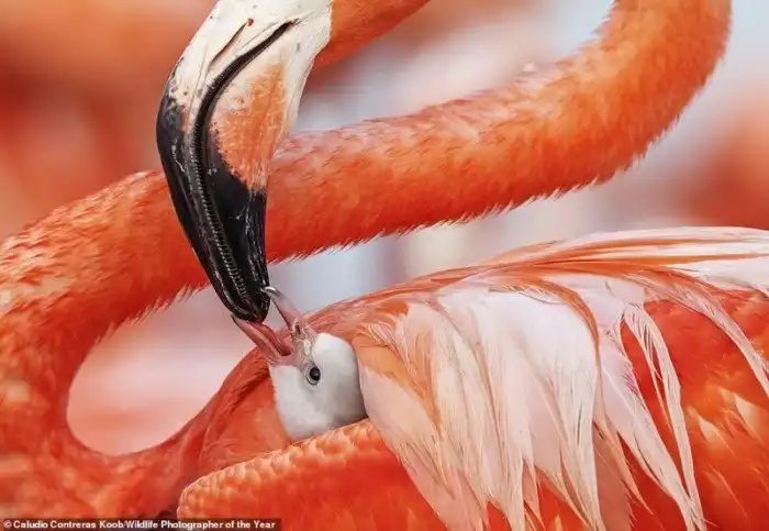 Снимок фламинго, кормящей своего детеныша, сделан в заповеднике Рио Лагартас на полуострове Юкатан.