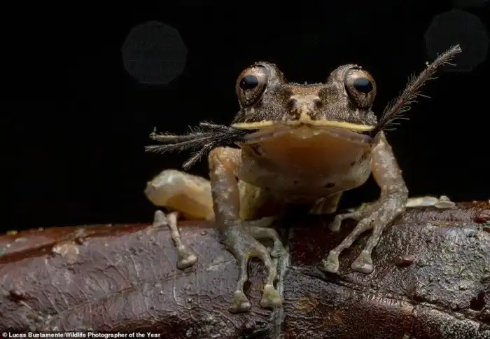Лукас Бустаменте обожает фотоохоту в ночных джунглях Эквадора! Именно там он застал лягушку-узкорота, которая только что сытно пообедала детенышем тарантула.