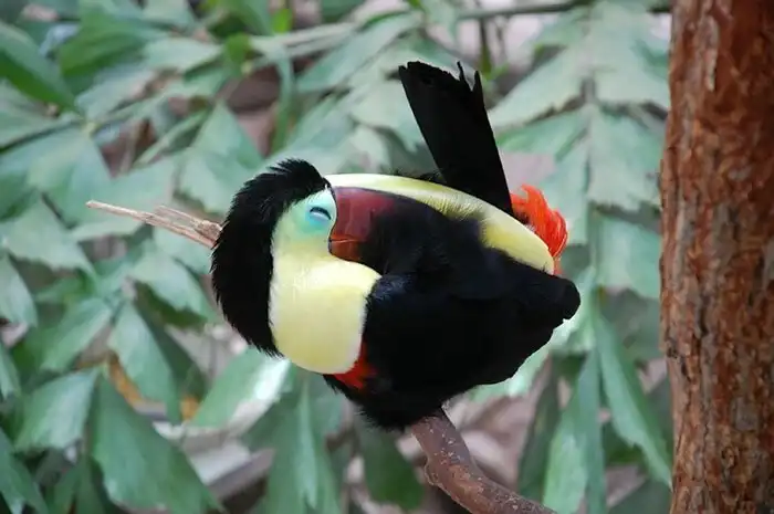 Пока другие птицы спят сидя на деревьях, тукан отличился. Он - единственная птица, которая спит, свернувшись калачиком. Тукан поворачивает голову, кладет клюв на середину спины, закрывается хвостом - так и получается "калачик"