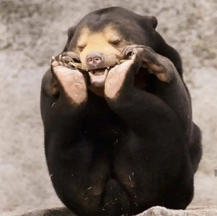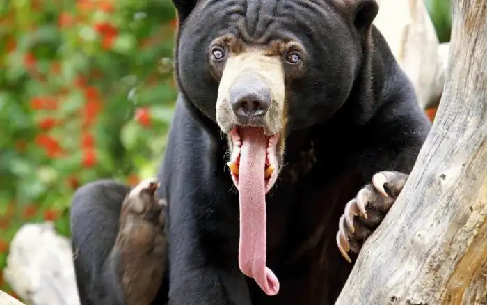 Но, всё же, главная фича малайского медведя — далеко не актёрские навыки. Ими он могёт блистать лишь в зоопарках, выманивая вкусняшки у двуногих приматов. Но в дикой природе бируанг добывает хавку с помощью длиннющего языка. И когда мы говорим длиннющий, то имеем в виду дуру в полметра.