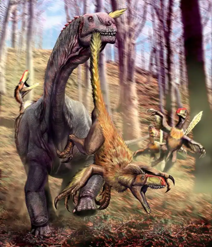 Динос относится к отряду дейнонихозавров — одних из ближайших родственников современных птиц. Среди своих братков-петушков Ютараптор был самым большим и сильным на районе. Когда палеонтологи откопали жухлую тушку рептилоида, сказать, что они были в шоке — значит ничего не сказать. Раньше учёным доводилось работать лишь с животинами чей максимум 1-2 м. А тут перед ними предстала дылда 7 м в длину и 500 кг живого веса.