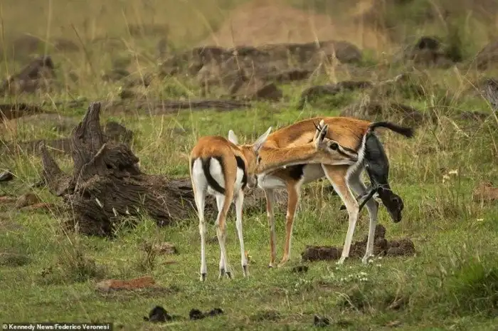 Она обескуражена такой наивностью. А может быть, действительно, на секунду принимает газель за собственное потомство и начинает ласково с ней играть
