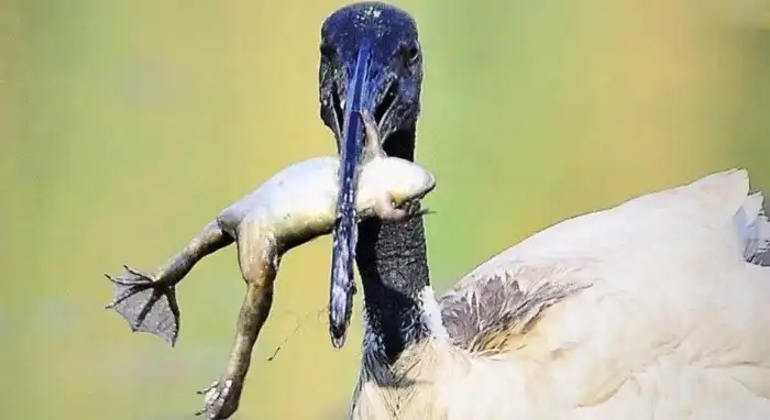 Подряхлевший аист кормится у воды. Возле побережий водоёмов пернатый находит излюбленную еду: членистоногих, моллюсков, амфибий и прочую шелупонь. Длинный клюв помогает ибису выгребать живность с илистого дна очередной речушки, поэтому при сезонном пересыхании пернатый не задумываясь покидает родные сердцу края.