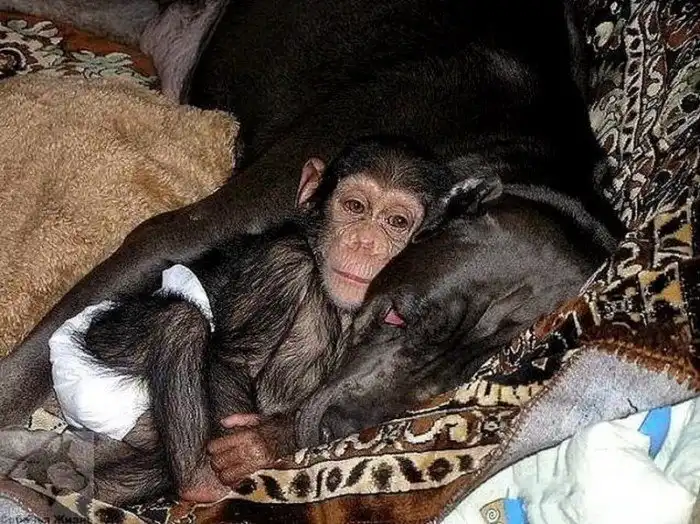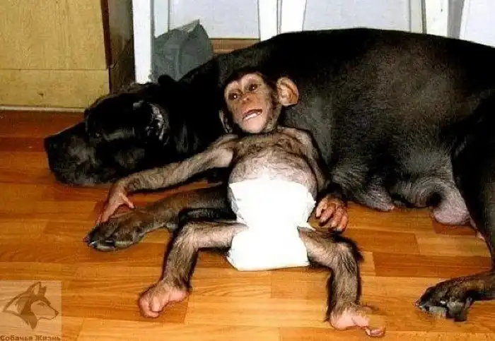 Маленького шимпанзе решил взять к себе на передержку один из работников этого зоопарка. Он не много переживал по поводу того, как детеныш поладит с огромной собакой, которая жила у мужчины в доме. Но решил рискнуть.