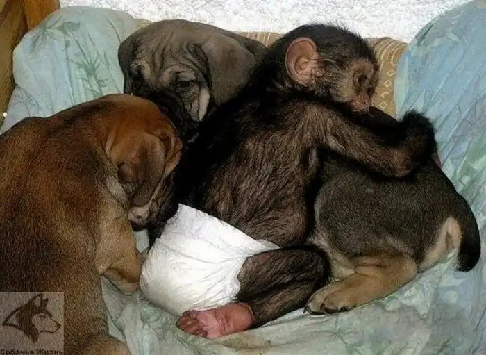 Да и сам малыш шимпанзе отлично поладил со своими новыми сводными братиками и сестричками: