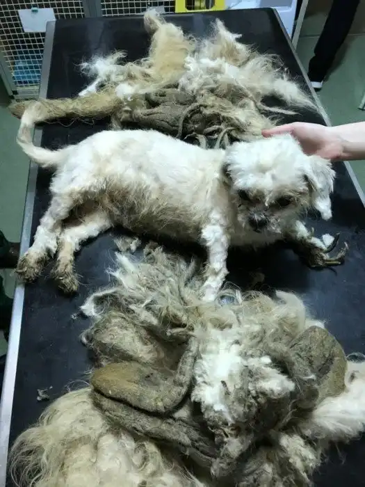 На собаке был почти что ковёр из свалявшейся шерсти весом в 1,68 килограмма, а на хвосте образовалась целая косичка длиной 25 сантиметров. На передних лапах отросли 10-сантиметровые когти, которые вместе с лишней шерстью превратили лапы в настоящие ласты.