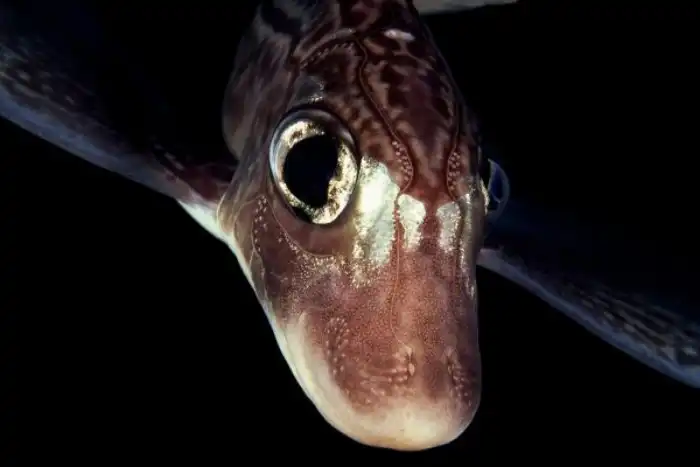 Вы не подумайте, парень не пытался поймать со дна морского самого дьявола, он просто хотел порыбачить на палтуса... Но вместо безобидной рыбёхи-перевёртыша на крючке оказалось вот это исчадье преисподней. Длинное тело, покрытое слизью, крепкие челюсти и гигантские, нет, ОХРЕНЕННО ОГРОМНЫЕ глаза. На суше это создание вызывает лишь одно желание — срочно позвонить экзорцисту.