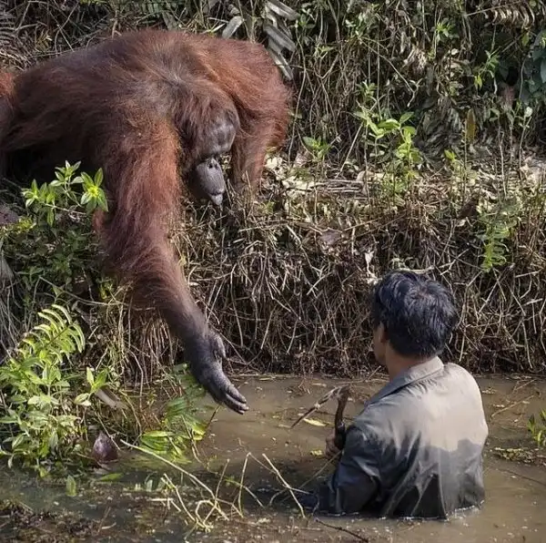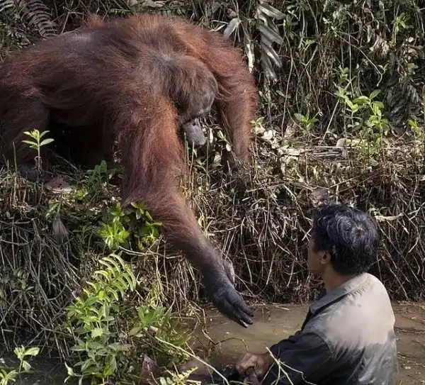 Орангутаны тоже люди. Это доказал рыжий великан, который заметил, стоящего в воде человека. Обезьяна спокойно подошла к мужчине и протянула ему руку помощи. Свидетелем этого трогательного момента стал индонезийский фотограф Анил Прабхакар. Действие разворачивалось на территории фонда по охране популяции орангутангов на острове Борнео, пишет DailyMail.