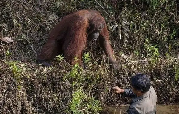 Мужчина стоял в воде потому что поступило сообщение о том, что в кустах у реки есть змея, и ему нужно было убрать её оттуда, чтобы она не навредила орангутангам. А животному показалось, что человеку нужна помощь.