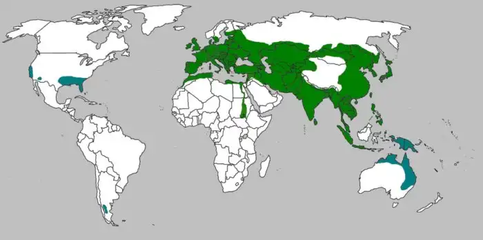 Зелёный цвет - историческое распространение кабана. Голубой - завезённые популяции.