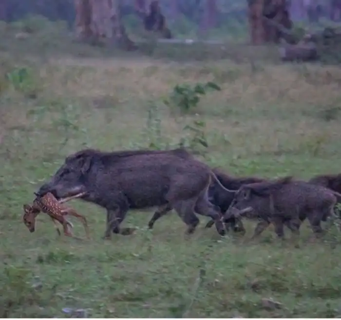 В основном, кабаны питаются падалью, специально кабаны не охотятся. Но если попадётся лёгкая добыча, в них взыграет инстинкт хищника.