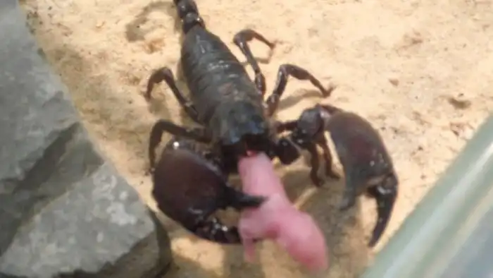 Самкам красноклешневого скорпиона живётся не легче человеческих. 7-10 месяцев малыши тусуются у мамки в животике. Новорождённые скорпионятки (?) первые две недели ютятся на мамкиной спинке.