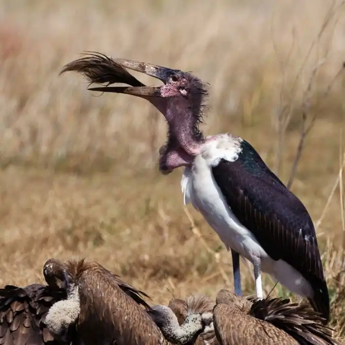 Но пачкать руки, а уж тем более, свой сюртук приличному гробовщику не положено. Поэтому птахе пришлось облысеть. Лысая башка, пусть и не даёт пирожка, зато оберегает птицу от всевозможных коронавирусов и прочих бяк, которыми кишат гниющие туши. За почётный статус «санитара саванны» приходится платить уродливой лысой головой.