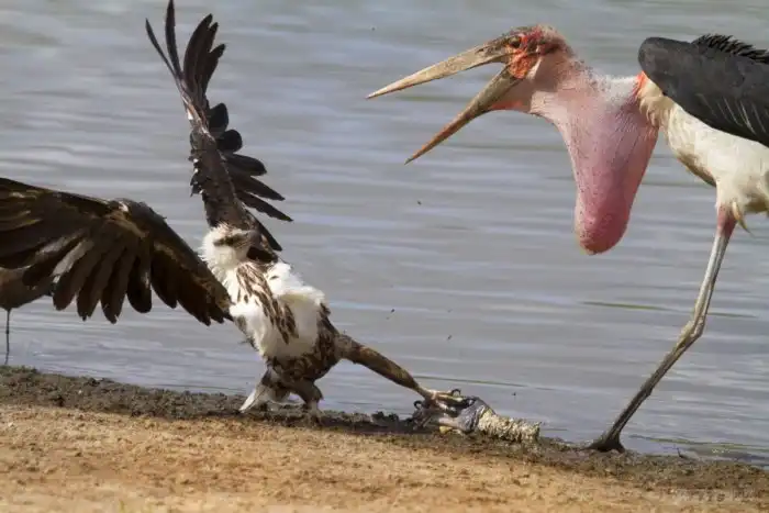 Птенчики у парочки появляются в самый разгар сезона засухи. Казалось бы, худшего времени для выведения потомства и не придумать. Но пока все страдают от жажды и мрут как мухи, марабу достают вилку, ножик и устраивают пир на весь мир как для себя, так и для своих деток. Поначалу родители приносят птенчикам живых зверушек. Но через 4 месяца ребятишки дербанят мертвичинку наравне со стервятниками и грифами.