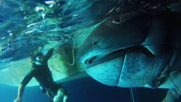 Из-за своей нерасторопности и неповоротливости большеротая акула становится жертвой каменных окуней. Эти наглые рыбы попросту отрывают от живой акулы целые куски.