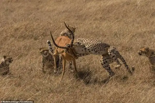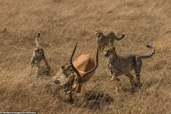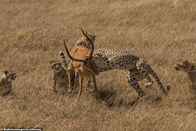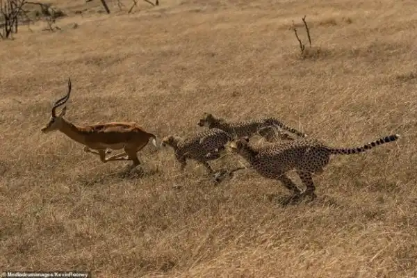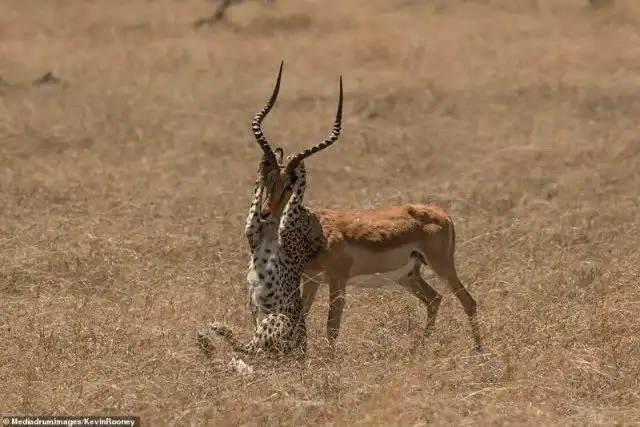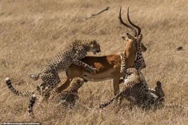 Однако у мощного самца импалы были другие планы. Могучим усилием он сбросил с себя гепардов и кинулся бежать от уставших хищников.