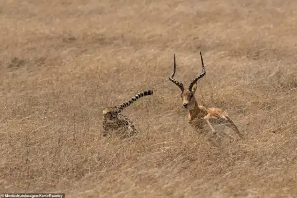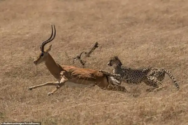53-летний Кевин Руни, инженер аэрокосмической компании из Глостершира, утверждает, что ему просто повезло поймать эти кадры во время фотосафари. "Мы увидели гепарда и шестым чувством поняли, что сейчас он будет нападать, - рассказывает руни. - Мы расположились так, чтобы животные были в прямой видимости - и тотчас самка бросилась на импалу". По словам Руни, он был уверен, ято они будут наблюдать финал удачной охоты.