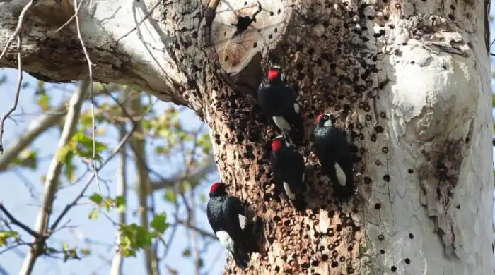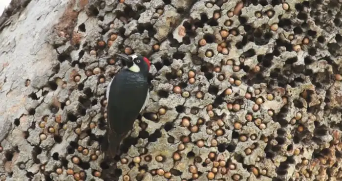 Только на одном таком стволе можно насчитать 60 тыс желудей! Но и это ещё не всё! Когда жёлуди усохнут в своих отверстиях, птицы перекладывают их в другие — поменьше. Да, все 60 тысяч! Так что, когда ты отказываешься помогать мамке закручивать 30 банок солений, вспомни какие запасы делают эти ребята. И вздрогни.