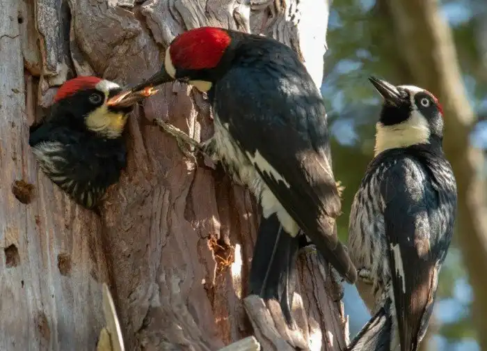 Чем же занимаются взрослые, пока молодняк следит за детишками? Они, как настоящие стахановцы, выполняют пятилетку за 3 года! Без устали и отдыха желудёвые дятлы ищут и прячут жёлуди. Для дубового плода птица подбирает дыру подходящего размера в коре дерева. Если таковой не находит, то выдалбливает отверстие сама. И всё бы ничего, если бы бережливость птахи не доходила до абсурда!