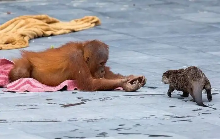 Семейство орангутанов из зоопарка Пайри Дайза в окрестностях Брюсселя дружит домами с соседями по территории - многочисленной семьей речных выдр. На их церемонные дружеские отношения нельзя смотреть без смеха!