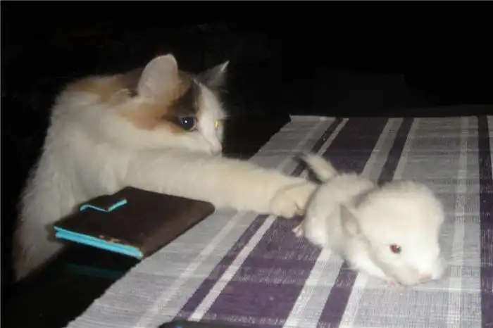 Кошка просто не понимает кто перед ней, то ли кроль, то ли крыс...