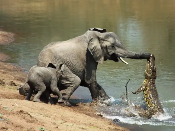 Порой случаются осечки, и крокодил хватает за хобот не детёныша, а взрослого слона. Тогда беды крокодилу не миновать. Разъярённый слон не будет долго церемониться с рептилией и может легко убить её.