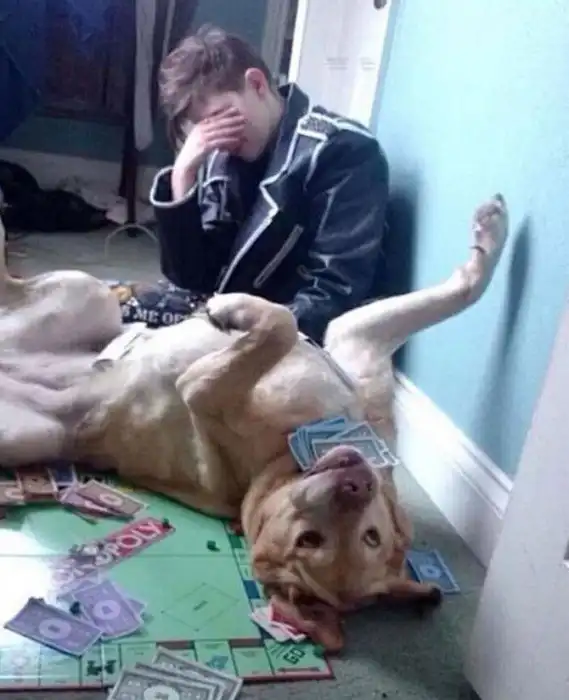 Мы играли в монополию, и хотели сфотографироваться, наш пёс не мог остаться в стороне