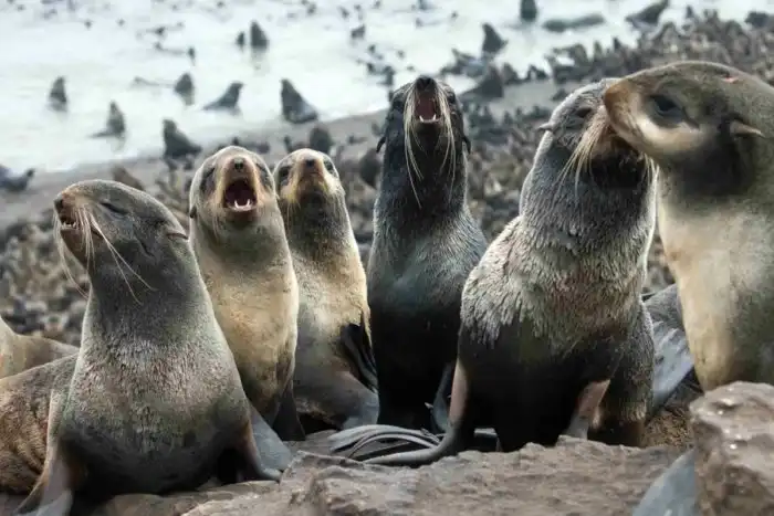 Мирными котики бывают лишь 5 месяцев в году с декабря по апрель. Это время животинки спокойно плескаются в морях-океанах небольшими группками и отжираются рыбой.