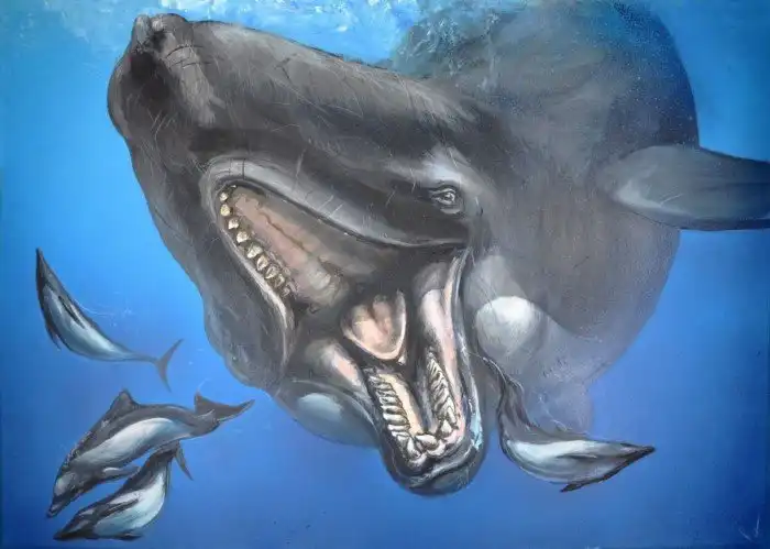 Не удивительно, что при таких параметрах Левиафана Мелвилла боялись как огня! Под его удар мог попасть каждый: от водоплавающих млекопитающих и рыбёшек, до древних усатых китов, таких как цетотерии. А они, между прочим, достигали до 8 метров в длину!