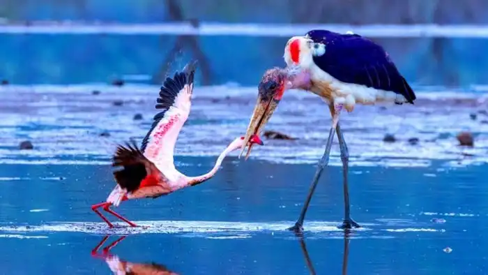 Аист марабу не только падальщик, но и успешный охотник. Он прекрасно рыбачит и отлавливает всевозможных птиц.
