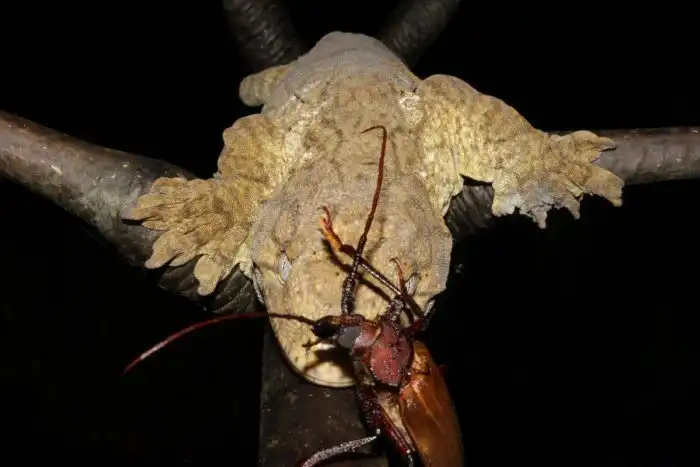 Как вы могли догадаться, животина ведёт ночной образ жизни. Днём увалень отдыхает, укрывшись в норе или дупле, а с заходом солнца ящерка отправляется в ночной дожор. Помимо жучков-паучков геккон с удовольствием лакомится плодами, листками, цветами, за что и получил название.