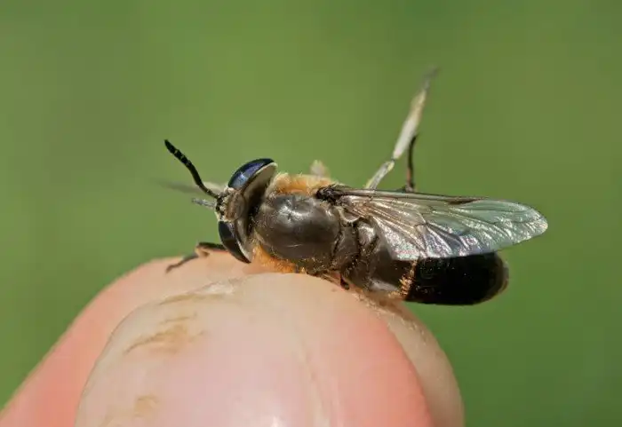 Несмотря на неброский черно-коричневый наряд, муха в 2,5 сантиметра, жужжащая как трактор, сразу приковывает к себе взгляды. Многочисленные требования отстать на нее не действуют, работает только волшебный удар тапком.