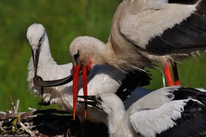 Змея делает гастроскопию аисту, чтобы проверить, всё ли у него хорошо с желудком. Дикая природа удивительна!