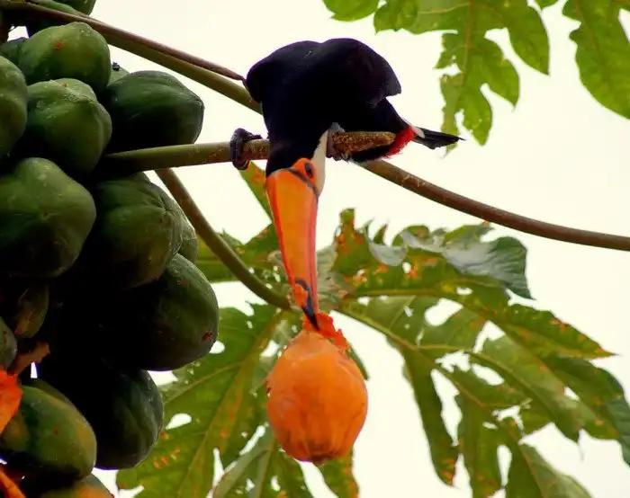 Разберём этот швейцарский клюв по порядку. Как столь солидный агрегат может служить холодным оружием более-менее понятно. Один точный удар и противник, покусившийся на птицу или её гнездо, остаётся без глаза. Между собой, кстати, туканы тоже регулярно устраивают махачи на клювах. Пернатые живут в небольших стаях. Фехтованием на носах туканы выясняют у кого больше и крепче, тем самым выбивая положение в иерархии.