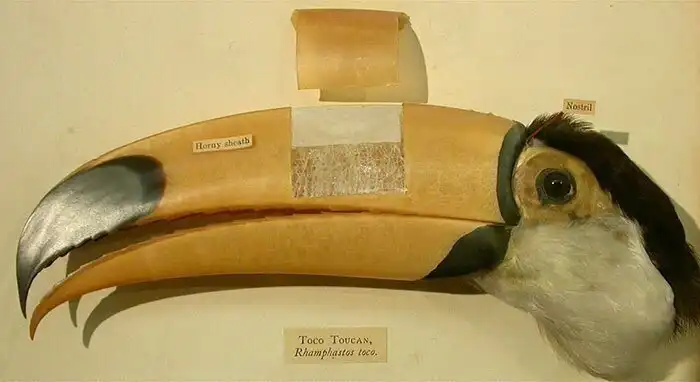 Но как же столь хрупкий птиц умудряется передвигаться, не качая мышцы шеи 24/7? На самом деле, несмотря на громоздкость, клюв туканов довольно легкий. Его внешняя оболочка состоит из кератина, а вот внутри тканей клюв заполнен лёгким, почти невесомым веществом — коллагеновой пеной.