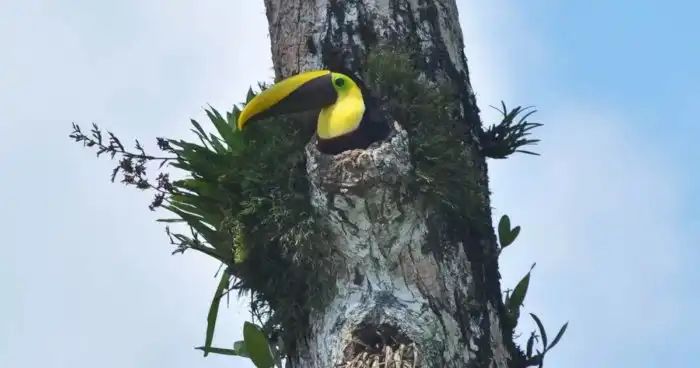 Кстати, свои гнёзда туканы устраивают в дуплах деревьев. Их они выдалбливают сами, как свои небезызвестные родственники. Если дубасить ствол лень, пернатый дубасит дятлов, отжимая уже готовые «квартиры».