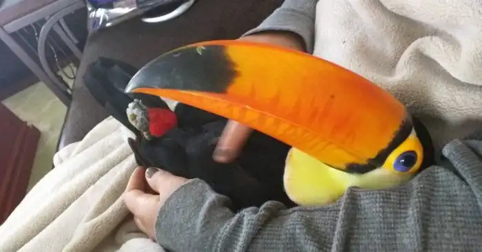 Вообще, туканы ребята коммуникабельные. Мало того что живут в стаях, так ещё и с человеком неплохо ладят. Поэтому находятся умники, которые заводят носатика дома.