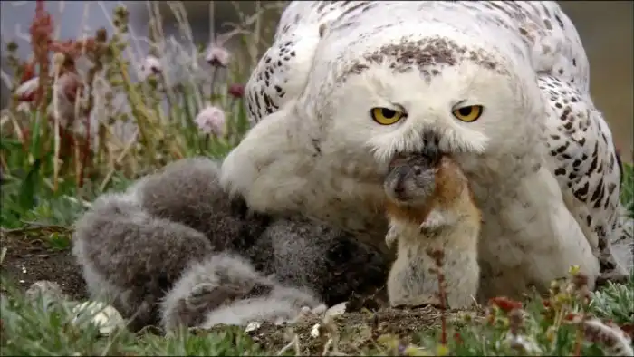 Это быстро просекли гуси, казарки, утки и другие пернатые. Мало того, что здесь их не сожрут, так ещё и потомство их защитят! Полярные совы яростно охраняют свою территорию от песцов — главных охотников за яйцами и птенцами в тундре. Поэтому под защитой находятся не только птенцы совушки, но и птенцы всех тех, кто поселился на её территории.