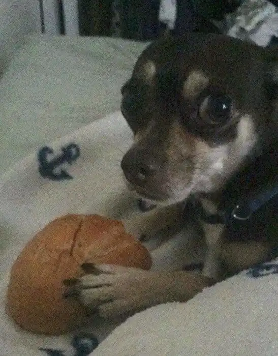 Она обожает хлеб, но непонятно откуда взялся этот кусок. Я такой хлеб не покупаю