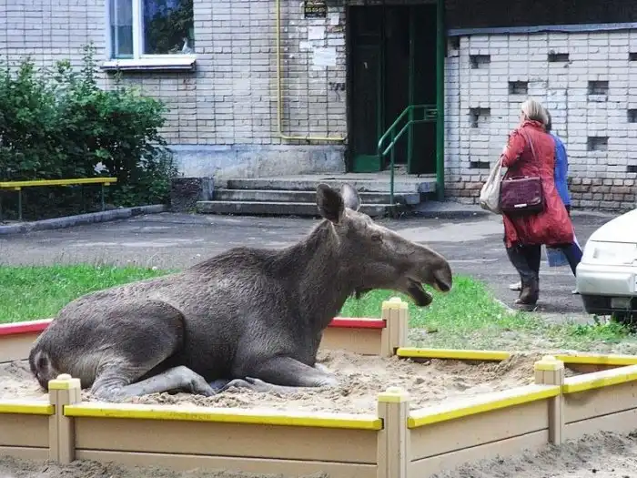 Итак, лось на вашей детской площадке. Что делать? Что ж, обычно лоси — животины мирные. Если их не трогать, бычить намеренно они тоже не станут. ВАЖНО! Это не значит, что лося можно тискать за уши и делать с ним селфи! Просто пройдите мимо, спрячьтесь и вызовите МЧС, чтобы зверя забрали в родной лес — тогда все останутся целы.