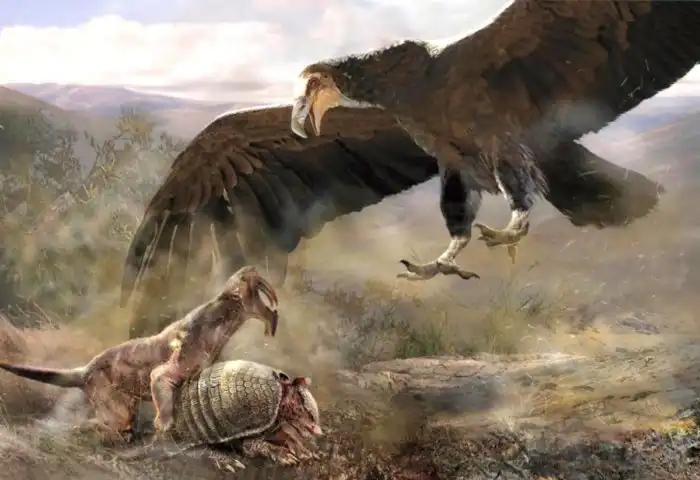 А вот способ охоты был совсем нетипичным: птица просто падала на стайку мелочи. 70 кило мяса, костей и перьев, умноженные на ускорение свободного падения, за секунду превращали животных в мясную лепёшку. В случае промаха, птица всегда могла догнать добычу благодаря мощным окорочкам.