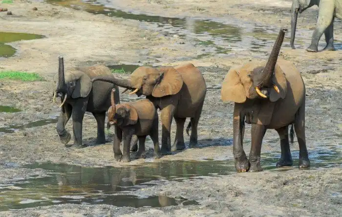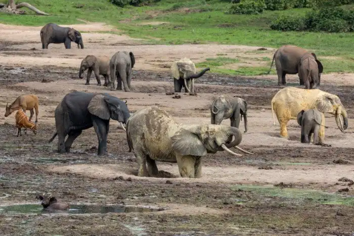 На такие грязевые лужи слоны приходят целыми группами. Валяясь в грязи, животные избавляются от паразитов и охлаждаются во время жары.
