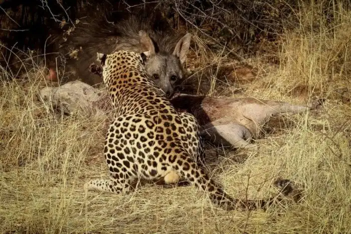 Признайтесь, вы же смотрите не на то, как бурая гиена отбирает у леопарда добычу, а на что-то другое 😏