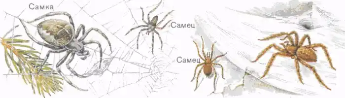 Слева пауки-крестовики, справа домовые пауки. Самки всегда больше.