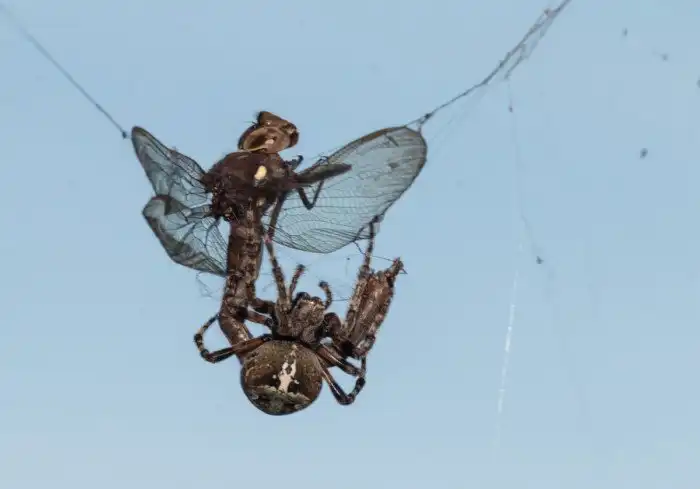 Иногда крупные насекомые не сбивают сеть-ловушку, а попадают в неё, что выдаётся паукам лишь на руку.
